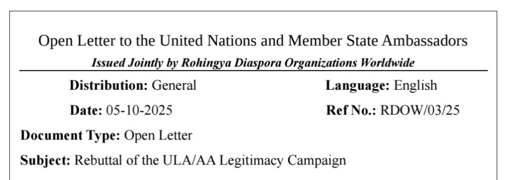বিশ্বজুড়ে ছড়িয়ে থাকা রোহিঙ্গা প্রবাসী সংগঠনগুলো জাতিসংঘ ও সদস্য রাষ্ট্রগুলোর রাষ্ট্রদূতদের উদ্দেশ্যে উন্মুক্ত চিঠি দিয়েছে। চিঠিতে আরাকান আর্মি (AA) এবং এর রাজনৈতিক শাখা ইউনাইটেড লিগ অব আরাকান (ULA)-কে বৈধতা দেওয়ার যেকোনো প্রচেষ্টা প্রত্যাখ্যান করার জন্য বিশ্বনেতাদের আহ্বান জানানো হয়েছে। চিঠিটি নিউইয়র্ক ও জেনেভায় জাতিসংঘের মিশনে আনুষ্ঠানিকভাবে জমা দেওয়া হয়েছে। এতে স্বাক্ষর করেছে বিশ্বের বিভিন্ন দেশের […]